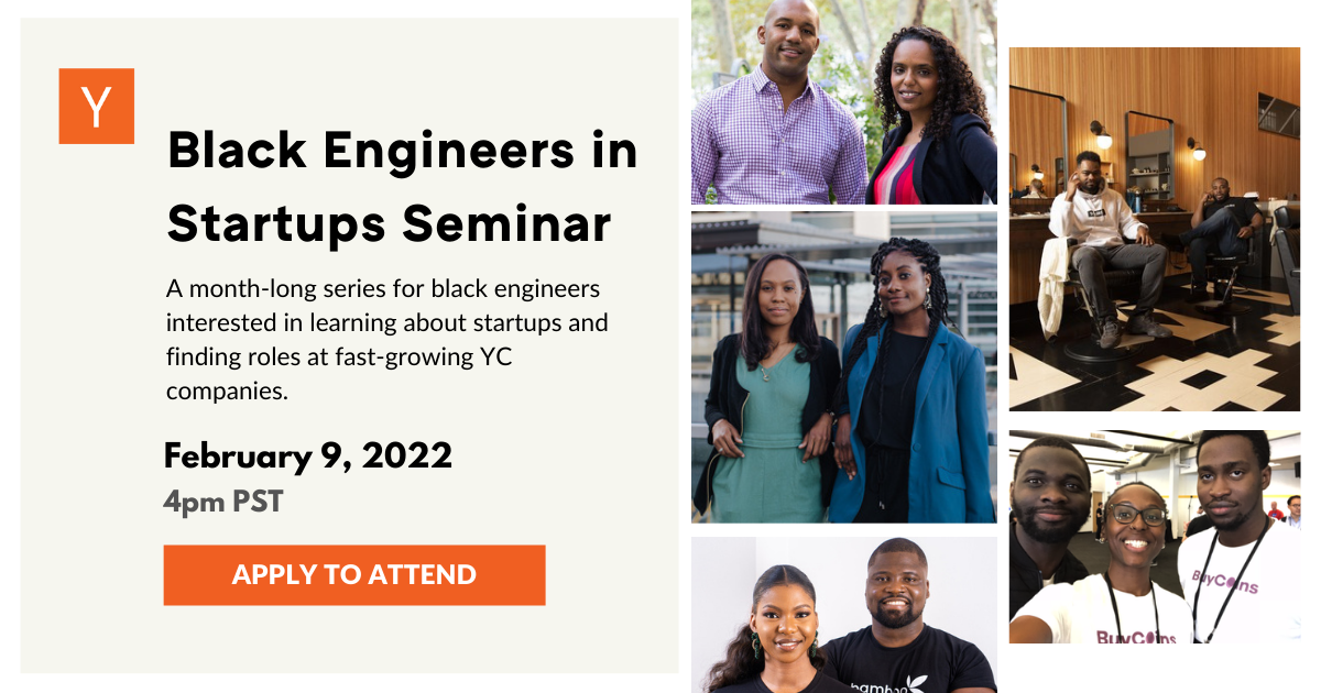 In February, Michael Seibel (Managing Director, Early Stage and Group Partner at YC) and Aston Motes (Investor, Director of /dev/color and first employee at Dropbox) are bringing together a cohort of black engineers who are interested in learning about startups and finding roles at fast-growing YC companies.
